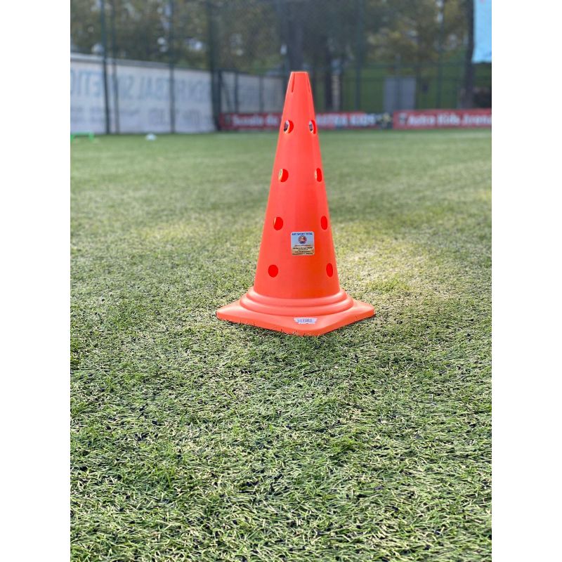 Con (jalon) cu 12 gauri, din PVC, rezistent la impact, ce permite multiple utilizari, inclusiv transformarea in mini-gardulete si realizarea unui sistem modular de prindere conuri si cercuri.