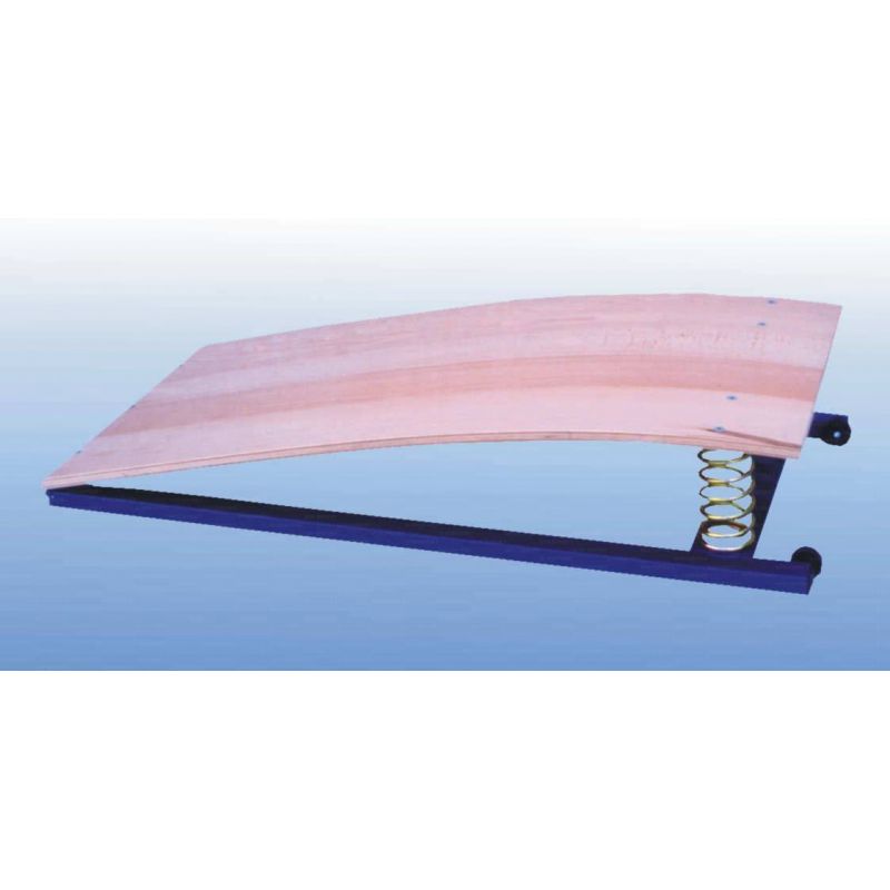 Trambulina din otel cu arcuri, cu suprafata din lemn laminat vopsit natural, sustinuta de doua arcuri de otel pe un cadru din otel galvanizat, cu roti de transport.