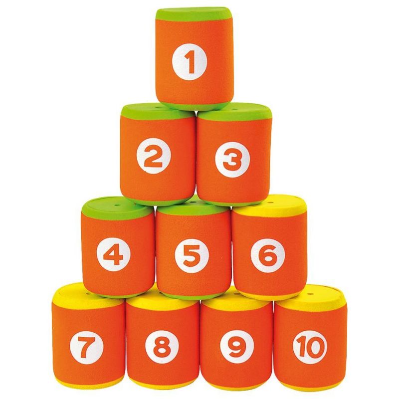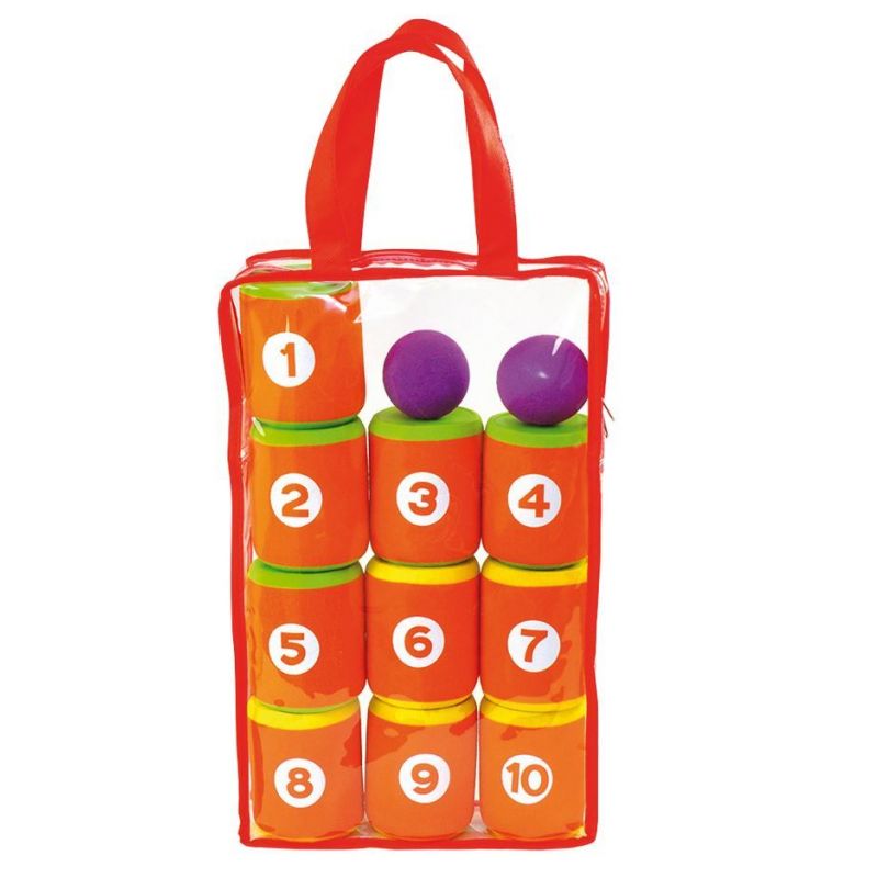 Joc de precizie in care trebuie sa arunci mingea pentru a dobori cat mai multe cutii. Datorita materialului, acestea nu fac zgmot indiferent de suprafata pe care ar cadea. Dimensiune minge 6 cm, dimensiune doza 7,5 cm.