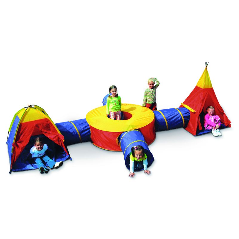 Set tunele de joaca Aventura, compus dintr-un set de 3 tunele cu diametru 46 cm, lungime 88 cm, dimensiune cerc: 90 x 47 cm, dimensiune cort mare: 105 x 105 x 85 cm, dimensiune cort mic: 93,5 x 67,5 x 100 cm.