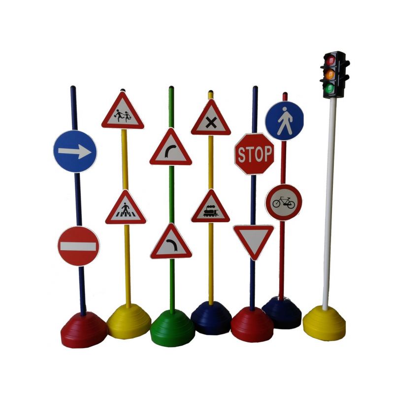 Contine 12 semne rutiere din plastic cu 6 suporturi (h 120 cm), 6 baze sferice (diametru 25 cm) si semafor de circulatie - iluminare manuala sau automata (bateriile nu sunt incluse).