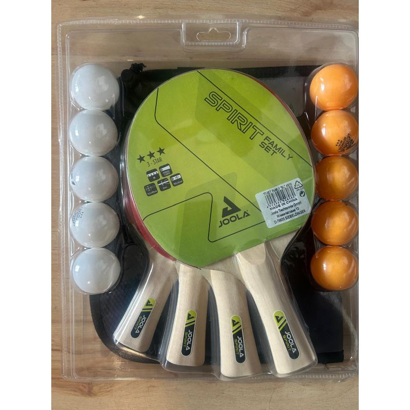Setul de tenis de masa Joola Family contine 4 palete tenis de masa Joola Spirit, 5 mingi tenis de masa albe, 5 mingi tenis de masa portocaliu