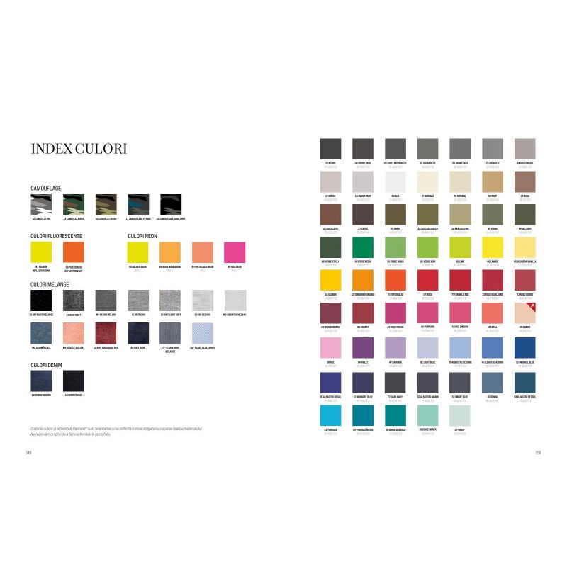 Culori: alb, gri deschis (97% bumbac, 3% vascoza), gri, gri maroniu, negru, albastru marin, albastru regal, denim, albastru azuriu, albastru deschis, turcoaz, kaki, verde mediu, verde mar, menta, lime, galben, portocaliu, rosu, roz zmeura, roz, violet.